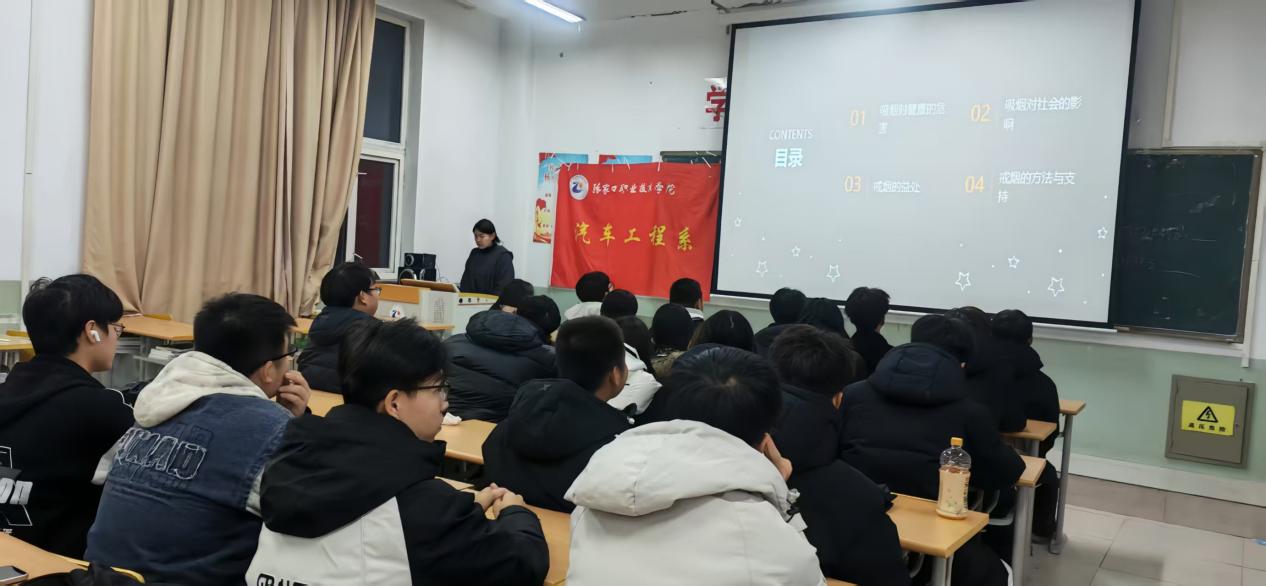 内容:首先强调了本次讲座的重要意义。当前部分学生对吸烟危害的认知不足,甚至存在模仿吸烟的行为,不仅损害自身身体健康,还影响校园整体风气。汽车工程系始终将师生身心健康放在重要位置,希望通过此次讲座,让大家深刻认识吸烟的危害,主动拒绝烟草,养成健康的生活方式,为未来投身汽车行业、拥有强健体魄打下坚实基础。