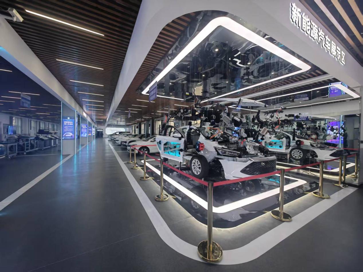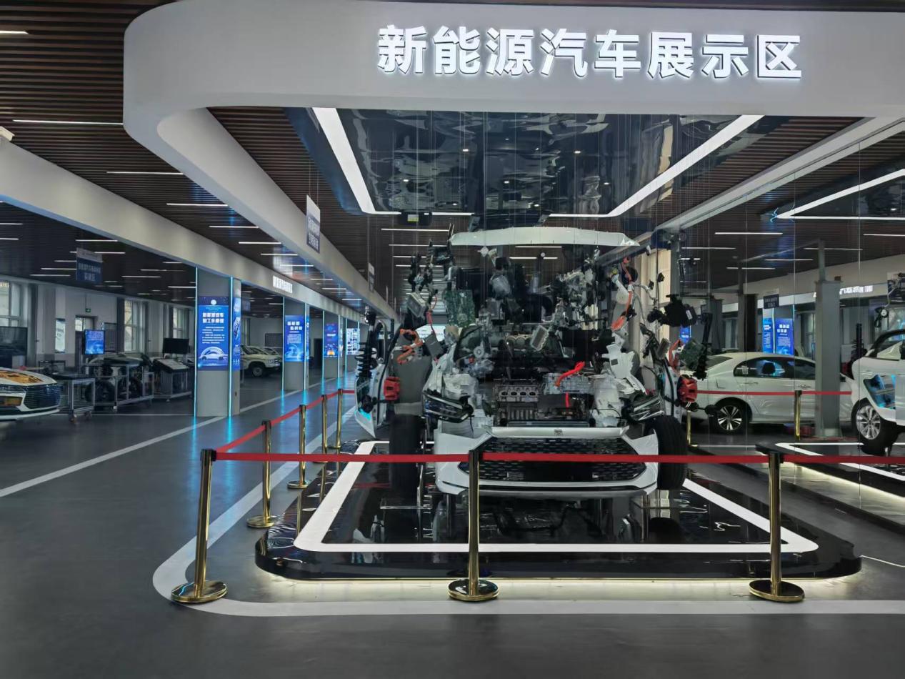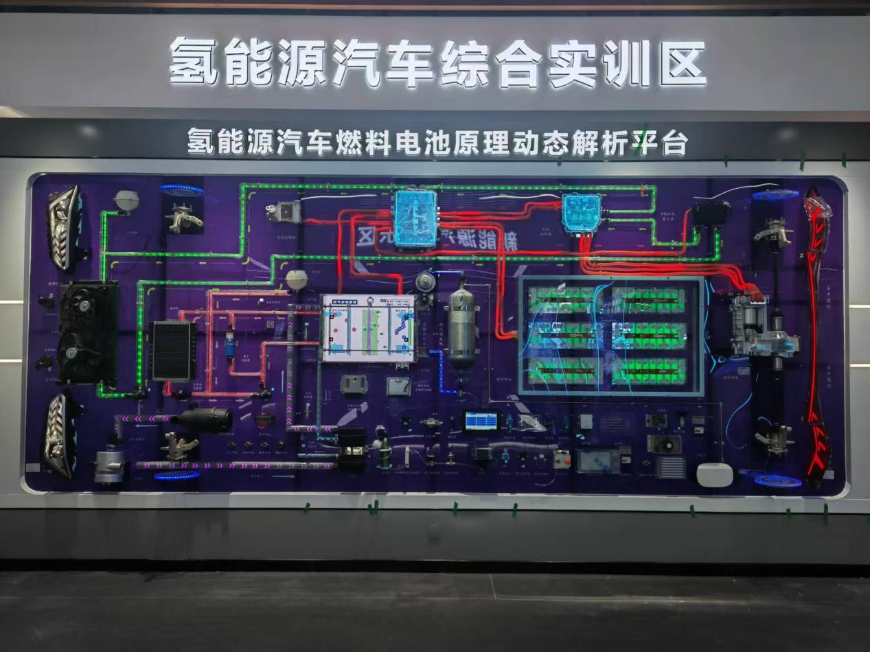本次升级改造后,汽车工程系实训中心焕然一新。全新打造的新能源吊装汽车展示区与氢能源汽车综合实训区成为亮点:实训区内不仅有完整的新能源汽车解剖模型,能直观展示整车结构与动力系统;更配备了氢能源汽车燃料电池原理动态解析平台,通过可视化管路与动态演示系统,让学生深入掌握氢能动力的核心技术。